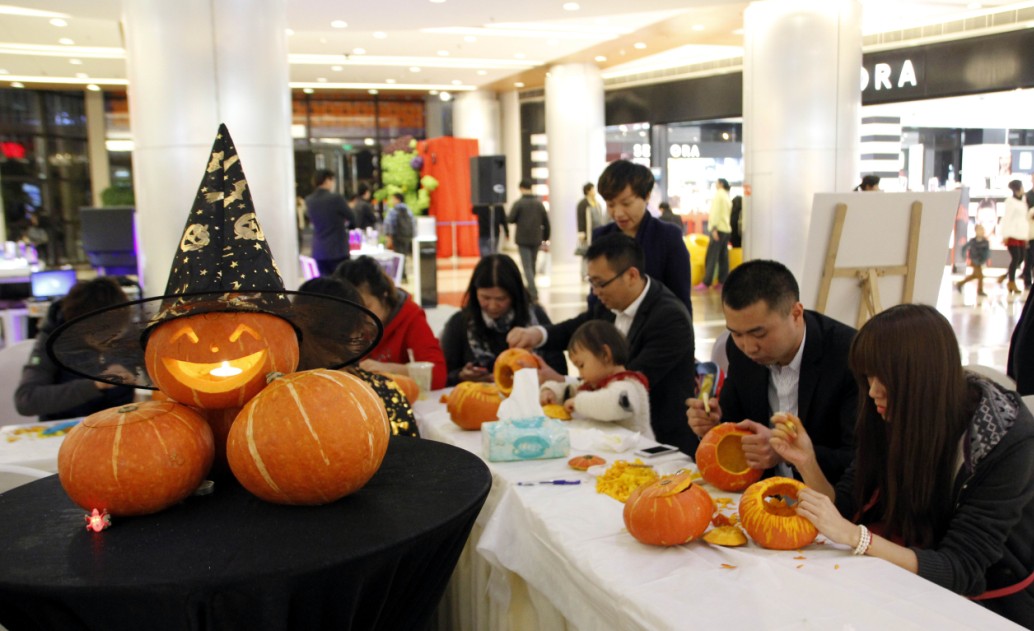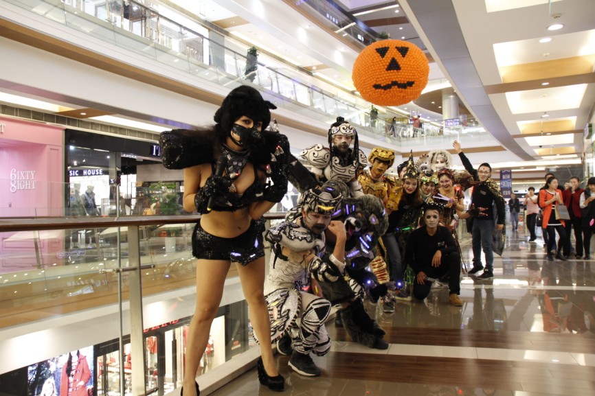 专业外籍表演团队的倾情演绎。各类造型逼真、形象各异的魔鬼玩偶。现场凭任意消费小票,就可以参加DIY制作南瓜灯,及画万圣节鬼妆。引来数百名顾客驻足观看并合影留念。为顾客带来一场前所未有的万圣魔鬼大餐。